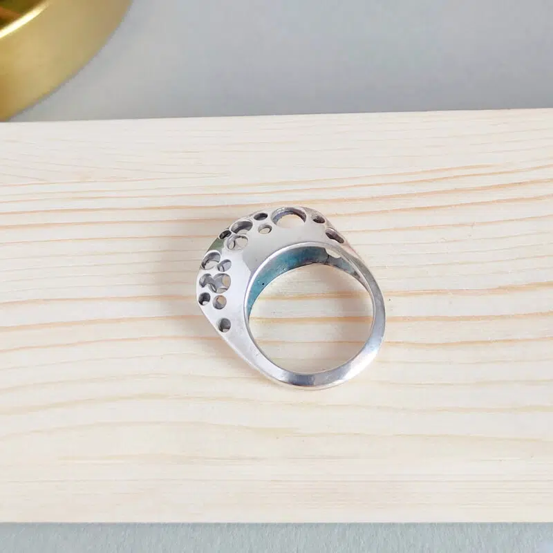 Anillo realizado en plata de primera ley. Mide 23mm de ancho x 9 mm de alto. Acabado brillo oxidado.Hacemos el anillo en cualquier medida si no encuentras la tuya en el desplegable. Escribenos y lo hacemos.
