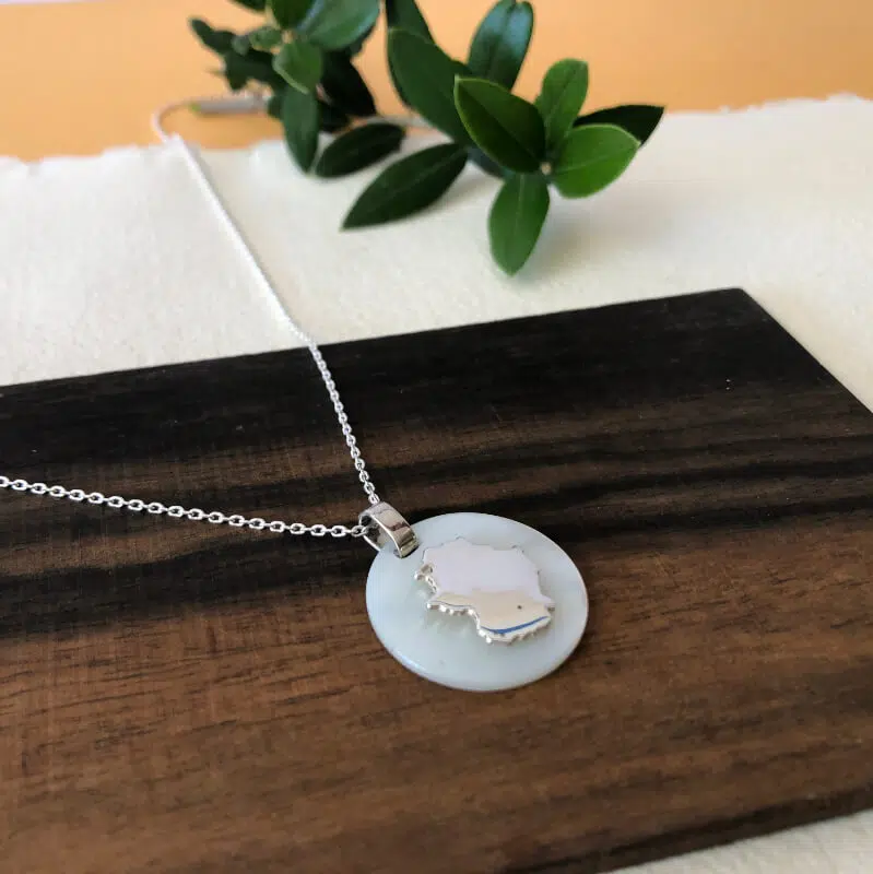 Colgante del mapa de Extremadura de plata con fondo de nácar. Ponemos el corazón donde quieras.