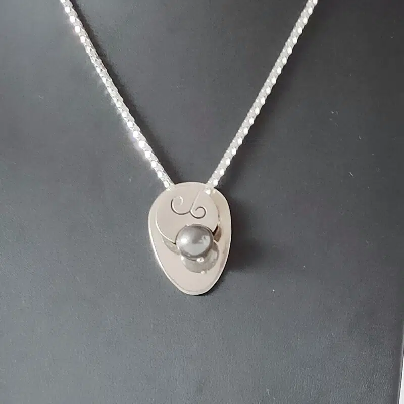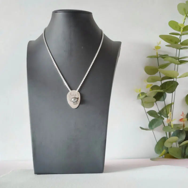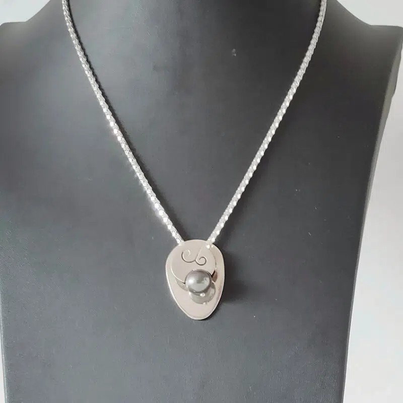 Colgante realizado en plata de primera ley con perla negra cultivada en agua dulce. Mide 32 mm de largo por 21 de ancho