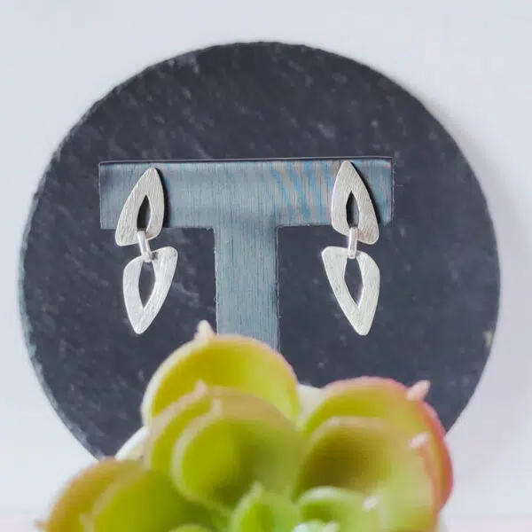 Pendientes realizados en plata de primera ley. Cierre de presión. Sus medidas son de 40mm de largo x 13mm. Acabado mate y brillo.