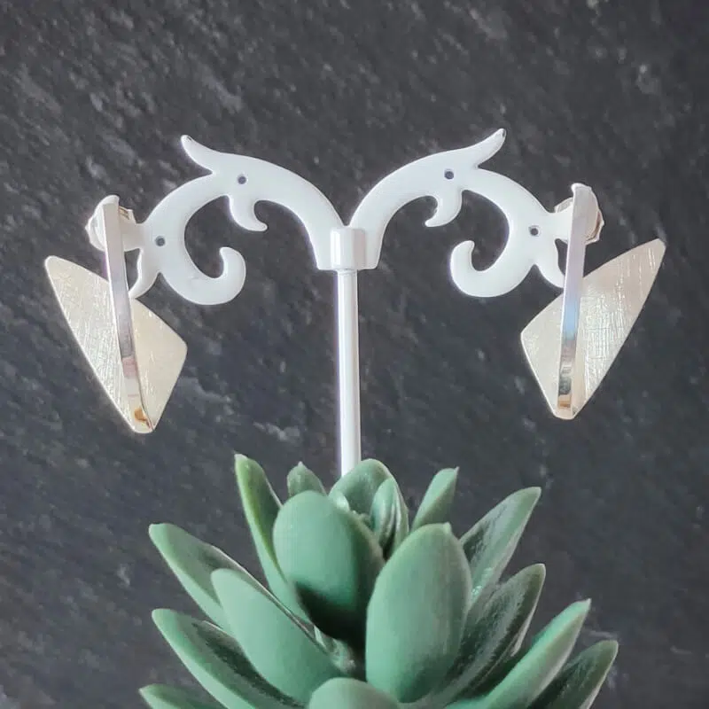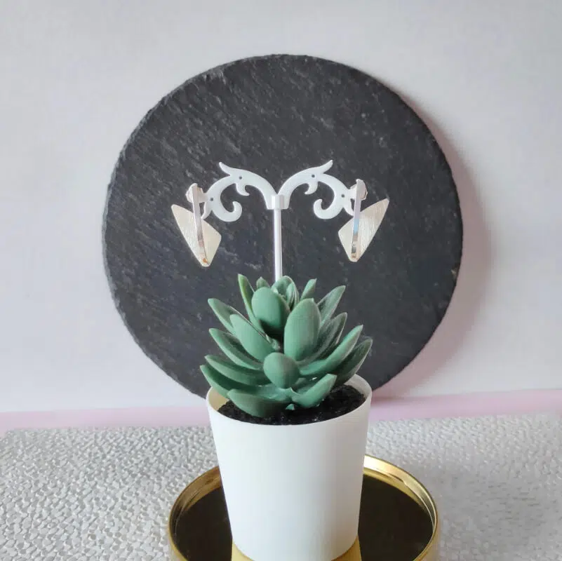 Pendientes realizados en plata de primera ley. Cierre de presión. Sus medidas son de 34mm de largo x 18mm. Acabado mate y brillo.